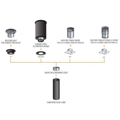 Utiliser la bague de raccordement acier (Réf.BRA) pour une connection sur conduit Poujoulat compatible avec les éléments droits de finition de plafond, les pièces de réduction, les raccords sur flexible, les raccords sur tubage rigide de la gamme fumisterie émaillée.