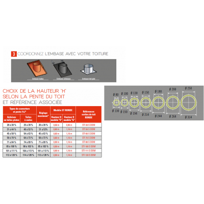 - la hauteur de la sortie de toît en cm en fonction du pourcentage de pente(cf tableau partie "Hauteur H, modèle G")