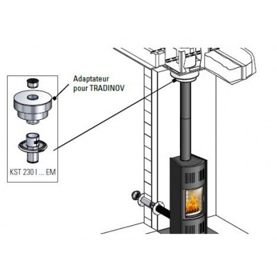 Le kit d'adaptation raccorde l'appareil en émaillé et permet l'utilisation du conduit INOX-GALVA Ø230**, en place dans la maison en respectant la conformité à la norme EN-15287-1.
